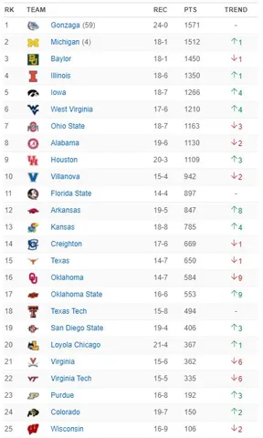 En cabeza de este Top 25, una semana más está Gonzaga que, una vez ha disputado todos sus partidos, ha logrado el título de la WCC en una temporada en la que los Bulldogs se mantienen invictos tras lograr triunfos ante Santa Clara y Loyola Marymount, de manera que, de vencer en el torneo de conferencia, se mantendrán en todas y cada una de las semanas en el número 1 del ránking de la Associated Press.