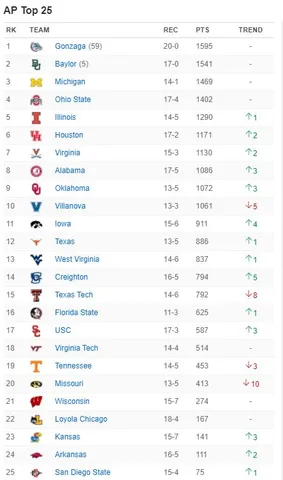 Dentro de este Top 25, no hay muchos cambios y el mismo sigue encabezado por Gonzaga, seguido de unos Baylor Bears que no han podido jugar los últimos encuentros por casos positivos, en la tercera posición la ya comentada Michigan, en la cuarta Ohio State y a la quinta sube un tercer equipo de la Big Ten como son los Illinois Fighting Illini.