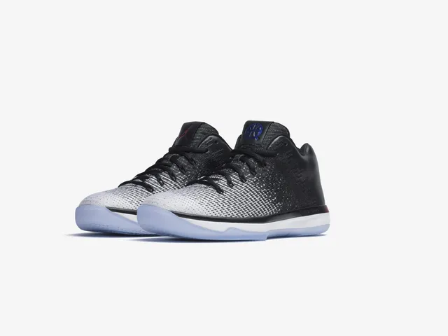 Empezamos con las Air Jordan XXXI Low Q54, con el upper en negro y blanco y algunos detalles en rojo y azul, los colores de la bandera de París.