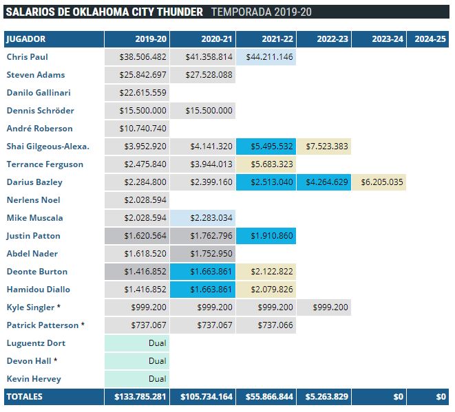 Aunque superan mínimamente el impuesto de lujo, Sam Presti va a contar en el futuro con mucha masa salarial para reforzar el equipo, incluso aunque siga Chris Paul (y su mastodóntico contrato) en la plantilla. En el verano de 2020 Gallinari, Nerlens Noel y André Roberson serán agentes libres, con lo que liberarán 34 millones que les permitirán afrontar el fichaje de algún agente libre interesante.