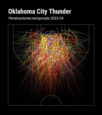 Y como en toda revolución se precisa de una resistencia. En este caso, la de Mark Daigneault y sus muchachos. Oklahoma City Thunder es el equipo que más penetraciones registra por juego (63.3), siendo los que más puntos generan (37.1), con el tercer mejor dato de acierto de la liga (53.8%). Y claro, siendo el decimosexto equipo en volumen al T3 (ojo, con un sensacional 39.8%) y primeros en puntos tras recuperación (19.7), cuando los ‘drives’ solo computan en posicional, otro camino es posible. Colíderes en la Conferencia Oeste, con el segundo mejor récord de toda la NBA (40-17).