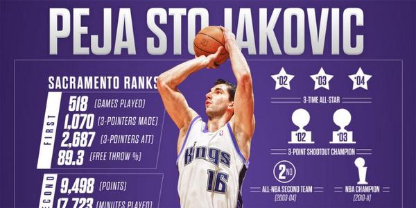 El próximo 16 de diciembre Peja Stojakovic se unirá al selecto club de jugadores europeos a los que una franquicia NBA les ha retirado la camiseta. En esa fecha, su clásica camiseta con el dorsal "16" subirá a lo más alto Sleep Train Arena, uniéndose a otros jugadores que han dejado huella en los Sacramento Kings, como Tiny Archibald (#1), Mitch Richmond (#2), Chris Webber (#4), Bob Davies (#11), Maurice Stokes (#12), Oscar Robertson (#14), Jack Twyman (#27), Sam Lacey (#44) y Vlade Divac (#21). Precisamente, este último nombre, el de Divac, es junto con Drazen Petrovic (#3 en los Nets) y Zydrunas Ilgauskas (#11 en los Cavaliers), uno de los tres únicos jugadores del viejo continente que hasta el momento había visto retirada su camiseta por un conjunto de la gran liga americana.
