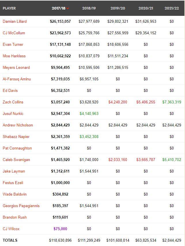 La actual plantilla de Portland comenzó a gestarse en el verano de 2015. En ese verano, Olshey decidió pulsar el botón de la reconstrucción, para reforzar al equipo mediante el draft. Traspasó a Batum a Charlotte y dejó marchar, como agentes libres, a hombres importantes como Robin Lopez y LaMarcus Aldridge. Como pasa en todos los casos, ni entrenador ni jugadores salen a perder, así que la rejuvenecida plantilla, liderada por Lillard y McCollum, hizo una temporada por encima de lo esperado y se clasificó para playoffs. En el verano de 2016, la gerencia pensó que el roster era el adecuado para aspirar a grandes cotas y renovó a Allen Crabbe (75 millones en 4 años), Moe Harkless (40 millones en 4 años), Meyers Leonard (41 millones por 4 años) y CJ McCollum (106 millones por 4 años). Además, fichó a Evan Turner por 70 millones por 4 años. Con esta política de fichajes, Portland se aseguraba contar a largo plazo con la plantilla que le había llevado a playoffs, pero se quedaba con un payroll altísimo que apenas le permitía hacer movimientos.