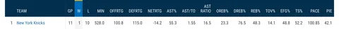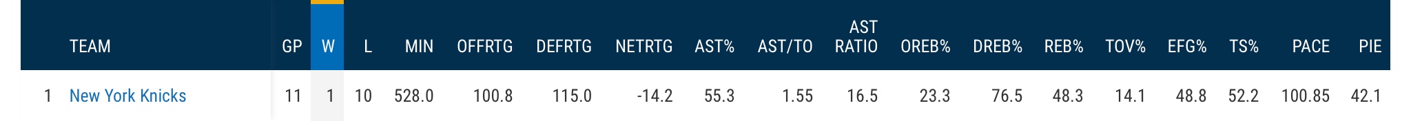 Tal es la magnitud de la baja de Porzingis que el ratio ofensivo, puntos anotados por cada 100 posesiones (OffRtg), disminuye de 104’1 a 100’8, en 3’3 puntos mientras que el dato más sangrante es el incremento de puntos recibidos por cada 100 posesiones (DefRtg), siendo de 106 puntos en el intervalo previo a la lesión y alcanzando los 115 puntos recibidos por noche siendo la peor franquicia en este apartado (117 puntos tras la derrota ante Raptors) -junto a los Nuggets.