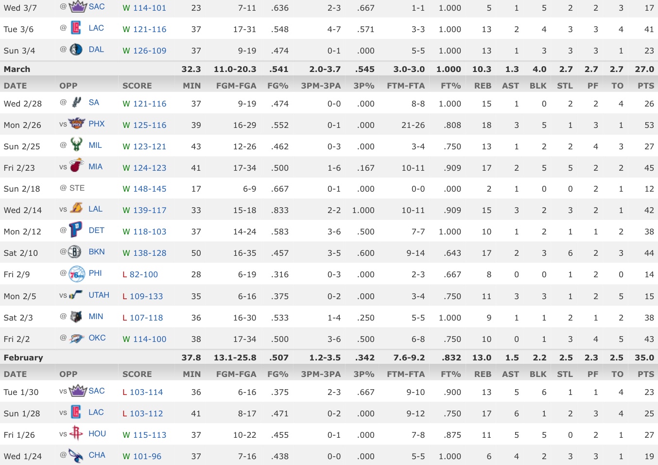 Tras una racha de 1-5 en la que llegó Nikola Mirotic, la franquicia cosechó 10 victorias consecutivas en las que “la Ceja” ha incrementado sus promedios hasta los 32 puntos, 12,7 rebotes y 2,7 tapones por partido destacando un 53-18 -mejores marcas de su temporada en puntos y rebotes- frente a Phoenix y hasta 5 partidos en los que superó los 40 puntos.