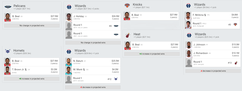 NOLA está formando un proyecto ambicioso a medio-largo plazo. En principio podría ser un impedimento para Beal, ya que el escolta de Wizards está consagrado en la liga. Pero tiene 26 años todavía. Los de Luisiana conseguirían una estrella de backcourt complementaria a Lonzo, mientras que a la capital llegaría un jugador contrastado como Jrue Holiday, el pick 4 del draft, que junto a su ronda, la 9, pueden elegir a dos jóvenes interesantes. Además llegaría otra ronda de Lakers de 2021.
