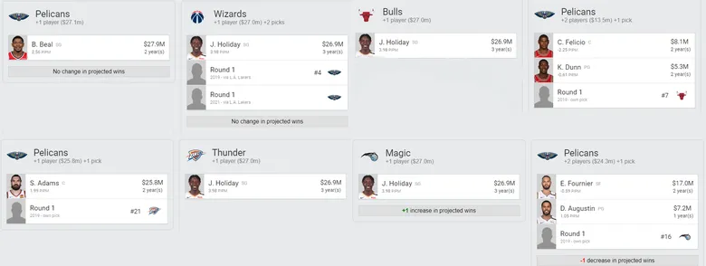 Otro año decepcionante de Oklahoma, donde no consiguen llegar a segunda ronda de playoffs. La consigna es clara, hay que realizar cambios. Y puede que la mejor opción sea que Westbrook tenga un acompañante donde sea élite en defensa y tenga tiro exterior (al contrario que Roberson), ahí encaja Holiday. Por parte de NOLA, la perdida de Davis les hace tener un hueco grande en el puesto de pívot que Steven Adams puede ocupar perfectamente, además de un pick 21 que siempre es un buen asset.