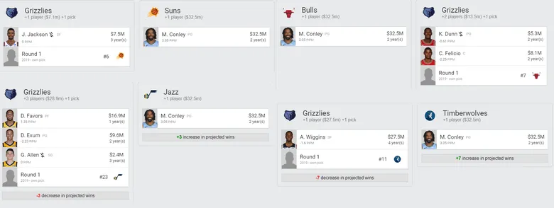 Minnesota necesita despegar de una vez. Su proyecto parece estancarse y si no reaccionan a tiempo, Towns podría hacerse un Davis y pedir el traspaso. Conley daría experiencia y seguridad. Memphis llegaría el pick 11 y “comerse” el contrato de Andrew Wiggins, que a pesar de ser muy criticado todavía tiene 24 años, por lo que si consiguen desarrollarlo pueden hacer de él un alero aprovechable.
