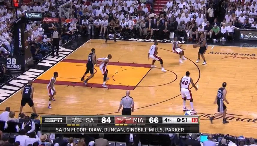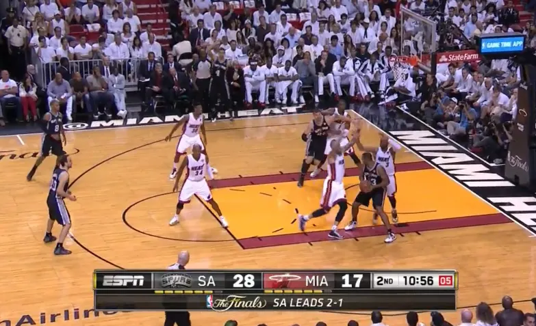 Wade y Bosh realizan un trap lejano a Manu tras recibir el bloqueo alto de Duncan. Tras superar Ginobili dicha presión gracias a que los Spurs siempre intentan poner un pase de apoyo para aliviar la presión, el resto de la defensa de Miami se queda por un momento en una situación incomodísima de 4 atacantes contra 3 defensores, mortal para casi cualquier defensa NBA.