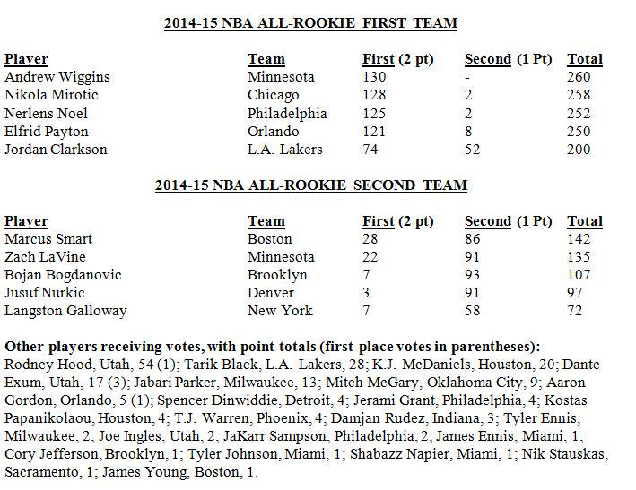 De entre ambos quintetos, tan sólo Andrew Wiggins ha conseguido el 100% de los votos para el primer equipo de forma unánime (130 de los 130 posibles). Junto a Zach LaVine, son los únicos jugadores de ambos quintetos que comparten el mismo equipo.