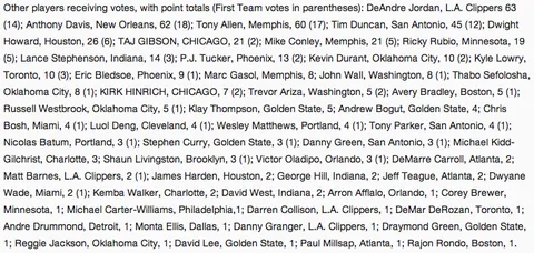 - Paul George (Indiana Pacers) — 161 votos (65 votos para el 1r equipo; 31 para el 2º)