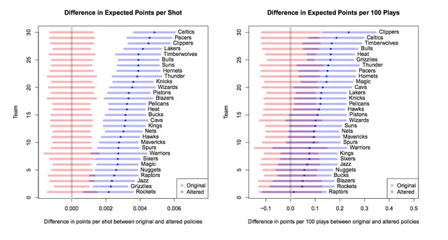 Dado que el tiro de media distancia esta desapareciendo por completo, la simulación presentada en el estudio es la siguiente: ¿qué pasaría si los equipos de la NBA tiraran un 20% menos de tiros defendidos (contested) desde la media distancia cuando quedan más de 10 segundos de posesión? Está claro que la ventaja de tirar menos tiros de media distancia es anotar más de 3 en 3, pero por el mismo coste, puede que se estén desaprovechando oportunidades de tiros claros y esto se transforme en balones perdidos. Con este 20%, los resultados muestran que los puntos por lanzamiento esperados son mayores en todos los equipos, así como también lo es la estimación de puntos anotados en 100 posesiones; es lógico ver que el equipo que menos variación tiene es Houston Rockets, un equipo que apenas utiliza el mid-range. Para dar validez a la investigación, se lleva este mismo al extermo, con una simulación que elimina el 90% de tiros de media distancia: en este caso, los resultados empeoran para todos los equipos de la liga, dado que se estaría usando una mala selección de tiro y desaprovechando buenos tiros. Esto magnifica más aún el mérito de Mike D’Antoni (entrenador de los Rockets), dado que queda demostrado que no basta con pedir al equipo que solo tiren triples, sino que también es necesario adaptar los sistemas ofensivos para que los tiros sean lo más eficientes posibles.