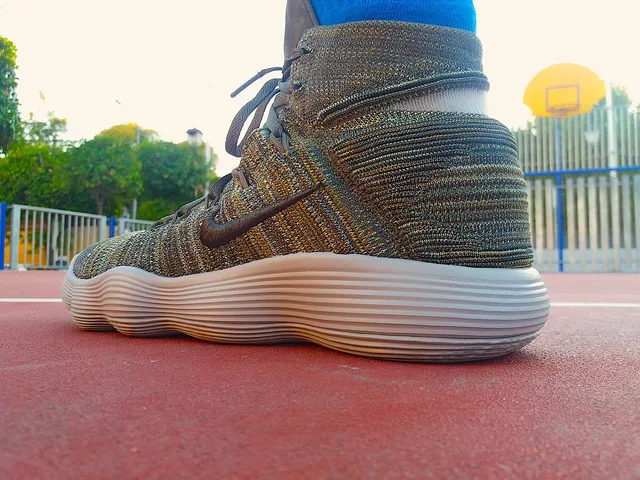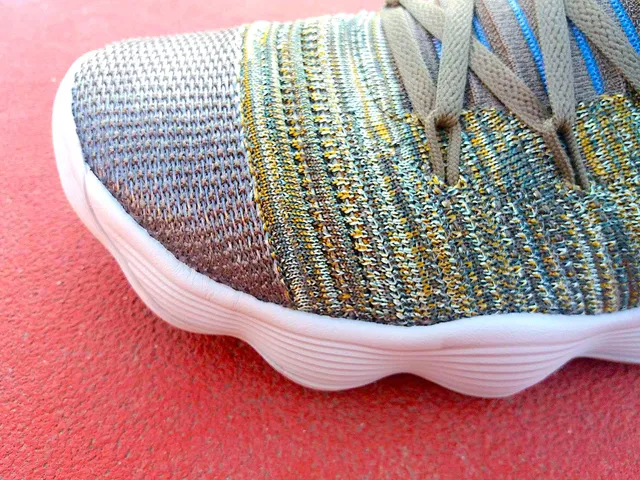En el talón, una gruesa pieza de espuma está recubierta por material Flyknit en su versión «normal», es decir, el tipo de hilo que estamos acostumbrados a ver en otras zapatillas. Un tercer tipo de textura la encontramos en el collar y la lengüeta, donde el Flyknit es flexible para facilitar la inserción del pie, reforzado con malla textil para hacerla más transpirable.