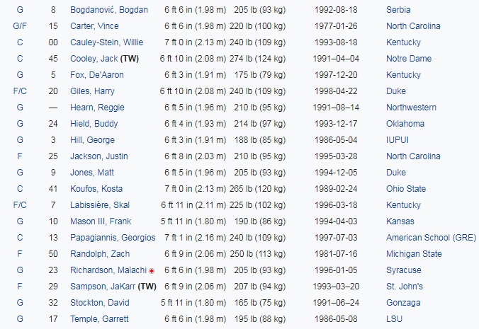 Futuro – 2017/18. Renovación por todo lo alto, llegan Bogdan Bogdanovic, Justin Jackson, George Hill, Vince Carter y Zach Randolph; la apuesta es clara, reunir un conjunto de jóvenes con mucho futuro y veteranos en mil batallas, que aportarán desde el primer minuto y serán los encargados de guiar a las jóvenes promesas de Sacramento. Además, consiguieron a uno de los proyectos de base más prometedores de la nueva hornada del draft: De'Aaron Fox, que promete ritmo, verticalidad y momentos muy divertidos.