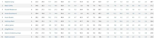 El bueno de Curry ha tenido uno de los mejores comienzos que un jugador puede desear. Los Golden State Warriors llevan un inmaculado 6-0 en la temporada y Stephen está teniendo un rendimiento estratosférico. Su peor anotación individual son los 25 puntos contra Houston Rockets y en cambio la mejor son los 53 ante los New Orleans Pelicans. En los encuentros no para de sumar, en todos ha metido un mínimo de 4 triples y ya en dos ocasiones ha llegado hasta los 8. Algo que por ejemplo, Peja Stojakovic nunca hizo en un partido de temporada regular. Todo esto le permite ser el jugador más eficiente de la liga, con un promedio de 38.7 por partido. Siete puntos por encima del rendimiento de Blake Griffin (31.2), casi diez de Russell Westbrook (29.7). La lógica dice que sus prestaciones bajen a medida que avance la temporada, pero todos tienen el susto en el cuerpo cuando juegan contra Curry.