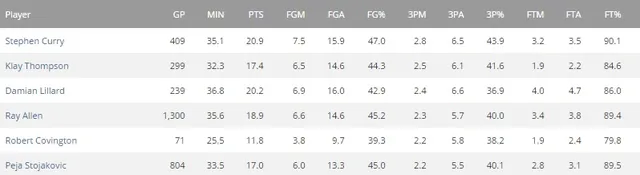 Otro punto a destacar es el extraordinario porcentaje de estos cuatro jugadores. No sólo meten mucho, sino que su porcentaje es muy alto. De ellos el líder en este aspecto también es Curry cuyo porcentaje asciende hasta el 43.9% ¿Podrá mantener el 40% de Ray Allen tras haber jugado 1300 partidos?
