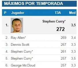 Aunque su trayectoria en la NBA aún no ha terminado y esos números son factibles que cambien en el futuro, para mejor o a peor, pero en la actualidad Stephen Curry es el jugador que más triples promedia en la historia de la NBA. La estrella de los Warriors promedia la friolera cifra de 2.8 triples por encuentro, mientras que en la segunda posición tenemos a su compañeros de equipo Klay Thompson (2.5) y al jugador de Portland Damian Lillard (2.4). El jugador histórico que continúa esta clasificación es Ray Allen (2.3), que actualmente es el jugador que más triples ha metido en la historia y que en su carrera ha jugado más partidos que los tres primeros juntos en esta clasificación.