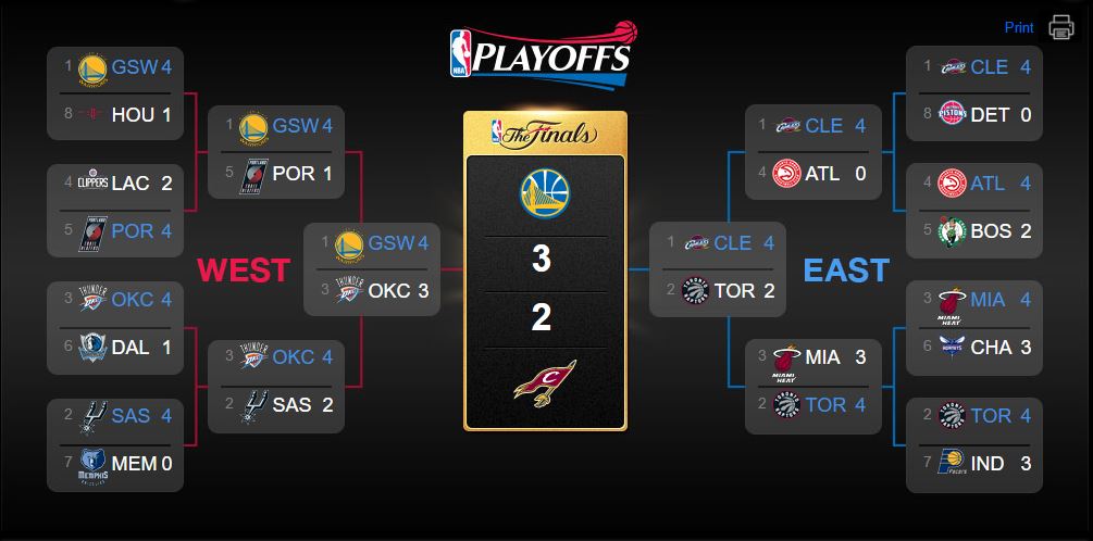 Gran comienzo de los Warriors en este quinto partido, superando en juego e intensidad a unos Cavs descentrados y donde su líder, LeBron James, sufría más que nunca la defensa de Iguodala, jugador clave de los Warriors en los momentos iniciales. Este comienzo se tradujo en limitar la productividad ofensiva de los Cavs a solo tres jugadores durante el primer cuarto: LeBron (12 puntos), Irving (7 puntos) y JR Smith (10 puntos), que suplían como podían la ausencia de Love y Thompson, desaparecidos en ataque. Iggy se mostraba clave, ya no sólo en defensa, sino llevando el peso anotador de los Warriors junto a Curry y Thompson, ambos dentro del partido desde bien temprano.