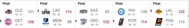 Dos equipos que estaban en una malísima racha se enfrentaban en el FedEx Forum. Los angelinos se despegaron en el segundo cuarto a base de una mayor circulación de balón y un gran acierto en sus tiros abiertos. La rocosa defensa de los Grizzlies no pudo con este juego coral de los Clippers, de modo que llegaron sin opciones al último cuarto. 6 jugadores de los Clippers anotaron por encima de 10 puntos. Los Grizzlies pierden su cuarto partido consecutivo y caen a la séptima posición de la Conferencia Oeste.